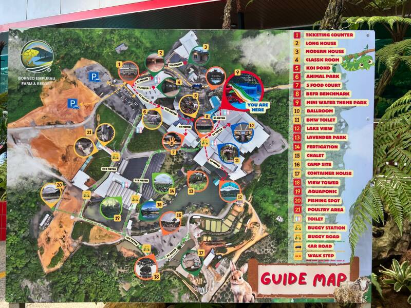 The guide map of Borneo Empurau Farm & Resort shows the overall layout of the resort and the locations of its main attractions and facilities. It highlights key areas such as the mini water theme park, animal park, food court, accommodation options, and agro-tourism features like aquaponics and fertigation. The map also indicates walking paths, buggy routes, car roads, toilets, and parking areas, helping visitors navigate the resort easily and efficiently.